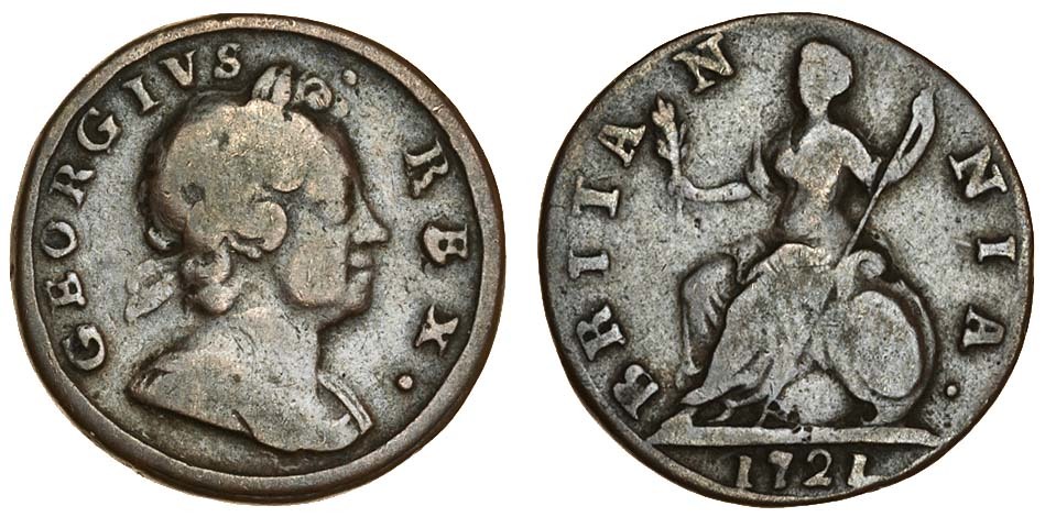 george I 91714-27), Farthing, 1721, laureate bust right, rev. Britannia, on a small, 19.4mm. diam. (clipped?) flan (Peck -), good fine
