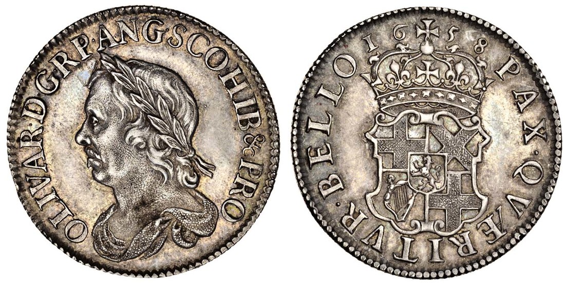 Cromwell, Shilling, 1658, laureate and draped bust left, rev. crowned arms of the Protectorate (ESC 1005; S.3228), toned, scratches in hair and in fields, scraped above forehead, about extremely fine