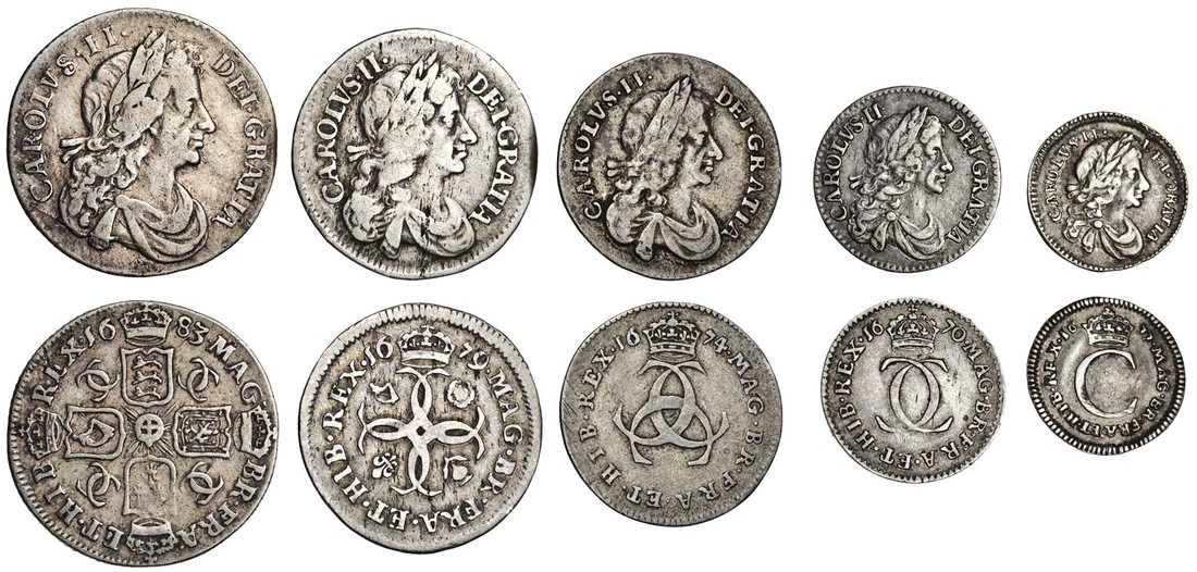 Charles II (1660-85), Sixpence, 1683, Fourpence, 1679, Threepence, 1674, Twopence, 1670, Penny, 1677, fine to very fine (5)