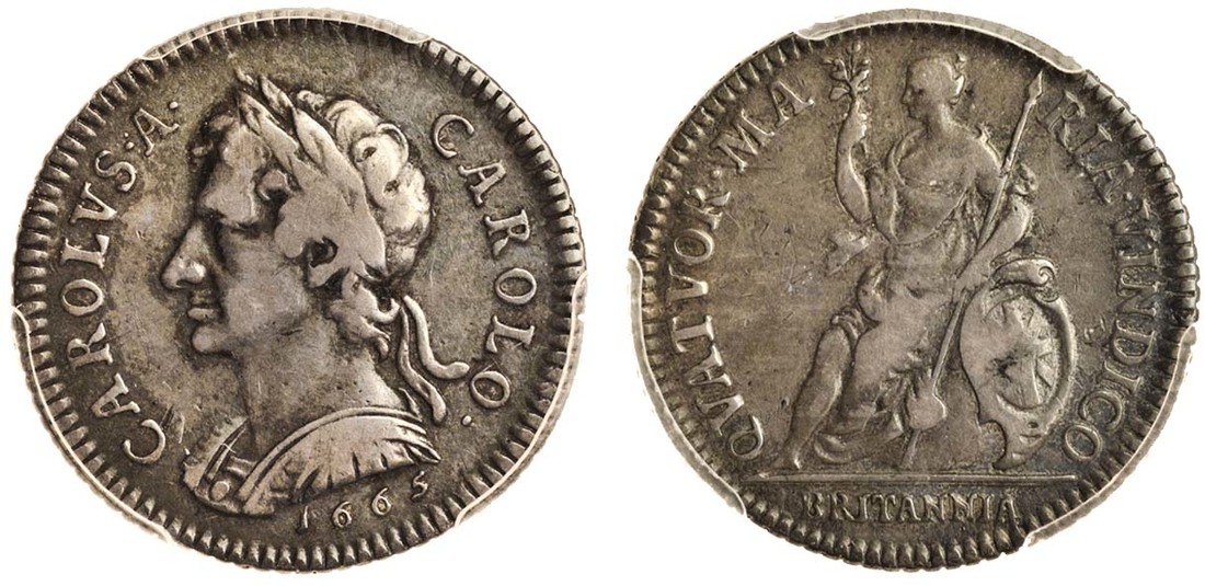 (x) Charles II (1660-85), pattern Farthing, in silver, 1665, laureate, cuirassed bust left with short hair, date below, rev. qvatvor.ma-ria.vindico, Britannia seated left, in ex. britannia, edge straight-grained (Peck 407), in PCGS holder, graded VF30