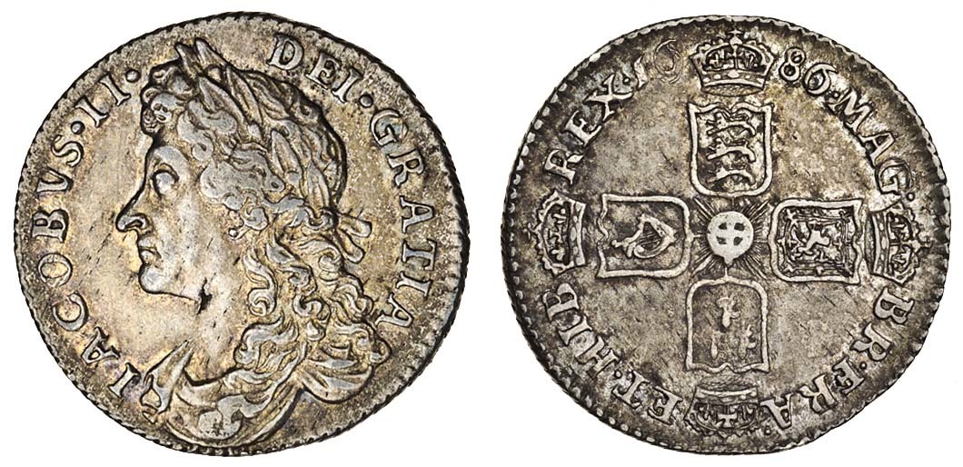 James II (1685-88), Sixpence, 1686, laureate, draped bust left, rev. four crowned shields cruciform (ESC 1525; S.3412), very fine