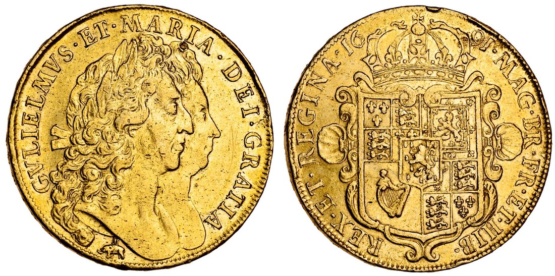 William and Mary (1668-94), Five-Guineas, 1691 tertio, conjoined busts right, rev. crowned shield (S.3422), minor edge marks, fine