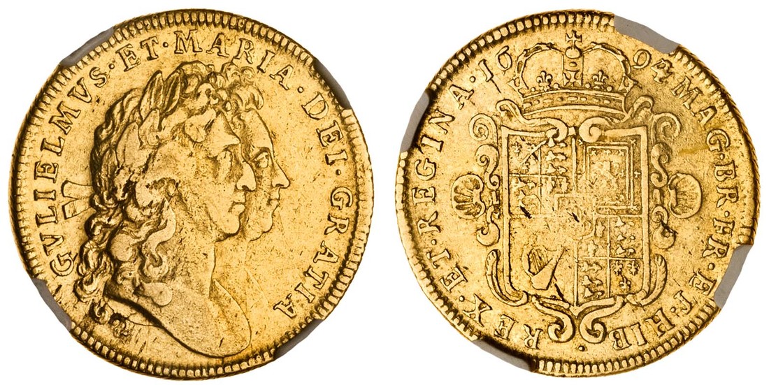 (x) William and Mary (1688-94), Two-Guineas, 1694 over 3, laureate, conjoined heads right, rev. crowned garnished shield (MCE 146; S.3424), in NGC holder, graded VF25