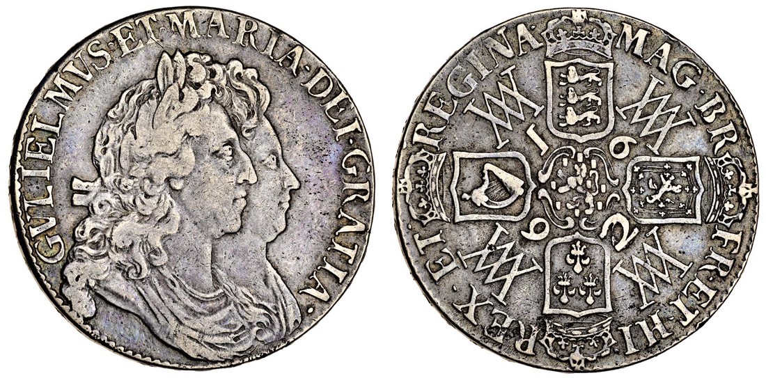 William and Mary (1688-94), Crown, 1692 over upside down 2 qvinto, conjoined busts right, rev. four crowned shields cruciform (ESC 83; S.3433), good fine