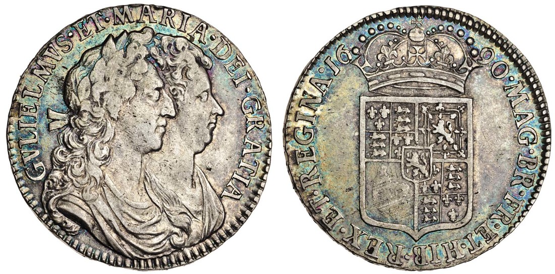 William and Mary (1688-94), Halfcrown, 1690 tertio, conjoined busts right, rev. second crowned shield, no pearls or frosting (ESC 512; S.3435), weak on Irish harp, very fine, old toning