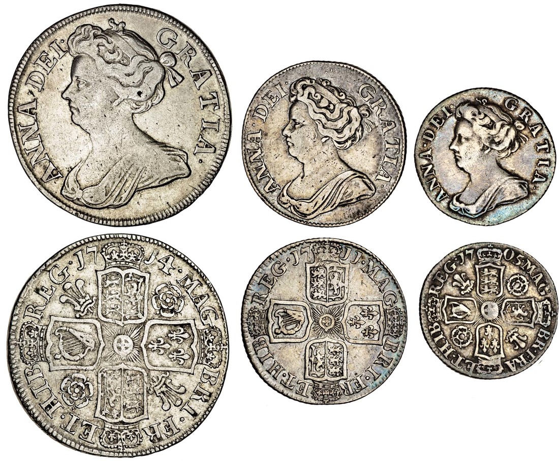 Anne (1702-14), Halfcrown, 1714, Shilling, 1711, Sixpence, 1705 roses and plumes, fine and better (3)
