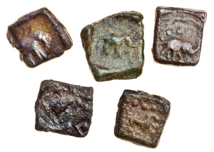 (x) India, Sangam Age (c.100 BC -250 AD), Chera Dynasty square AE Coins (4), elephant standing right / bow and arrow (3), horse standing right / bow and ankus (1); Pandya Dynasty, square AE Coin, fish in tank / unclear, all small size, circa 2g. (Mitchiner, Southern India II, 54-62, 92-96, 146), fine to very fine for type (5)