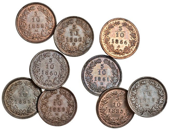 Austria, Franz-Joseph I (1848-1916), AE 5/10-Kreuzer, 1858 M, 1859 M (2), 1860 V (2), 1861 B, 1866 A, 1885 (2) (KM. 2182, 2183), extremely fine or better, some with lustre (9)