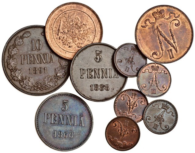 Finland, Alexander II (1855-81), AE 5-Pennia, 1866, Penni (4), 1866 (2), 1873, 1875, Alexander II (1881-94), 10-Pennia, 1891, 5-Pennia, 1888, Penni, 1893, Nicholas II (1894-1917), 5-Pennia (2), 1913, 1917 (KM. 1.1, 1.2, 4.1, 10, 11, 12, 15, 17), extremely fine or better, some with lustre (10)