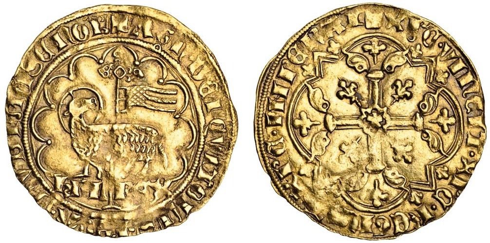 France, Charles VI (1380-1422), Agnel d'or, 2.55g, first emission, 10 May 1417, Romans mint, Agnus Dei and flag within tressure, krl rex below, rev. ornate cross with lis in quarters in quadrilobe (Dup.372A; F.290), a tad off-centre and soft in places, mostly well struck and very fine