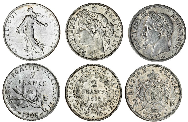 France, Napleon III (1852-70), 2-Francs, 1869 BB, Republic, 2-Francs, 1895 A, 1908 (KM. 806.2, 817.1, 845.1), the first very fine, others extremely fine (3)