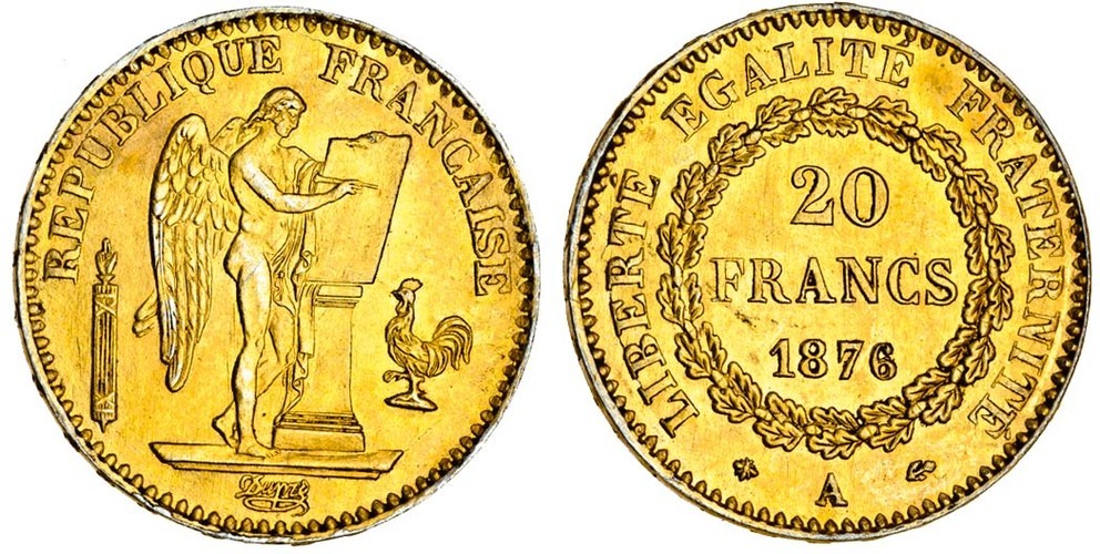 (x) France, Third Republic (1871-1940), contemporary copy in platinum of a 20-Franc, 1876 A, angel, rev. value in wreath, good very fine