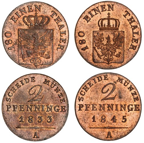 Germany, Prussia, Friedrich Wilhelm III (1797-1840), 2-Pfennig, 1833A, Friedrich Wilhelm IV, 2-Pfennig, 1845A (KM 406, 448), both uncirculated with lustre (2)