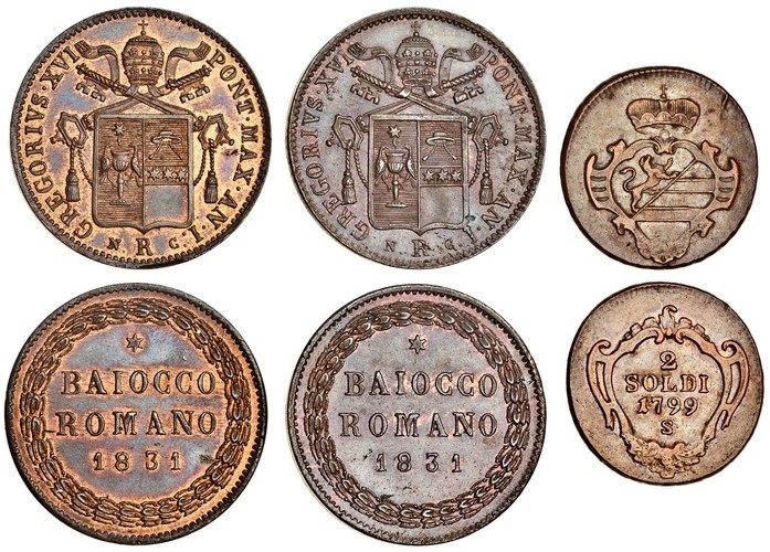 Italy, Görz, AE 2-Soldi, 1799 S (KM.9.5 ), Papal States, AE Baiocco, 1831 R (2), with and without a stop after '1' of 'AN. 1' (KM.1314), the first good very fine, the last two good exremely fine with some lustre (3)