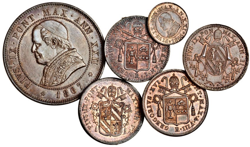 Italy, Papal States, Gregory XVI, AE Half-Baiocco (2), 1831 I R, 1838, VIII R, Pius IX (1846-78), AE 4-Soldi, 1867 XXII R, Centesimo, 1866 XXI R, Half-Baiocco (2), 1847 II B, 1850 V R (KM. 1313, 1319, 1340, 1355, 1370, 1374), about exremely fine to uncirculated, some with some lustre (6)