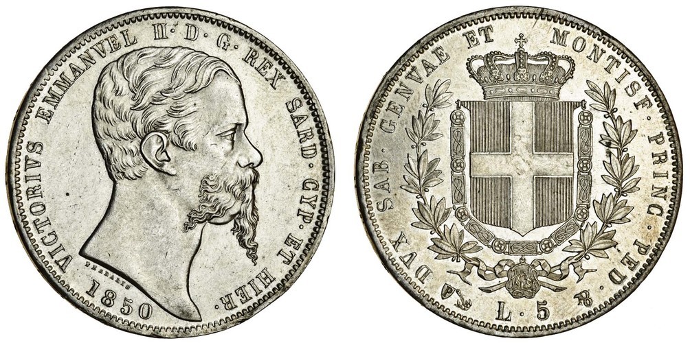 (x) Italy, Sardinia, Vittorio Emanuele II (1849-61), 5-Lire, 1850 Genoa, head right, rev. crowned shield (Gig.30; Pag. 370), cleaned, marks on edge, lustre around design, extremely fine