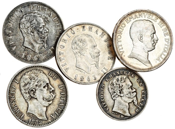 Italy, Tuscany, second provisional government (1859-61), Lira, 1860 (KM.85), Italy, Vittorio Emanuele II (1861-78), 2-Lire (3), 1863 N, shield reverse, 1863 T, denomination on reverse, 1882 R, Vittorio Emanuele III (1878-1900), 2-Lire, 1914 R (KM.6a.1, 16.2, 23, 55), about very fine to good exremely fine, some scarce (5)