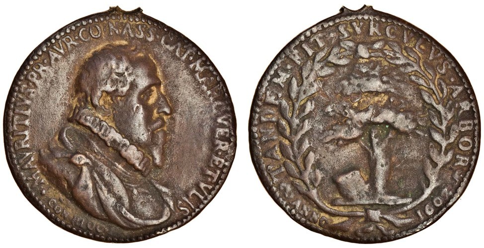 Netherlands, Maurice of Nassau, The Capture of Grave, 1602, cast medal, in bronze, by Conrad van Bloc, 18.15g, draped and cuirassed bust in ruff right, con bloc f below, rev. orange tree growing from a trunk, tandem fit svrcvlvs arbor, anno 1602 (MI i, 180/181), wavy flan, remains of a loop at 12 o'clock, some verdigris, fine