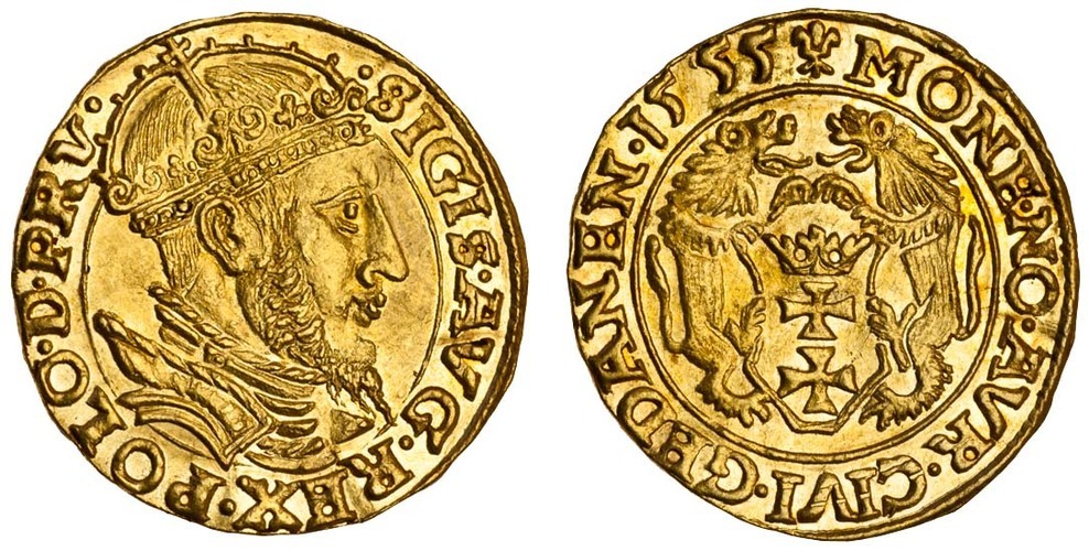 Poland, Sigismund II Augustus (1548-72), Ducat, 3.51g, 1555, Gdansk (Danzig), sigis. avg.rex.polo.d. prv., crowned and cuirassed bust right, rev. mone. no. avr. civi. gedanen., city shield with supporters (F.2; H.Cz.489 - R3), extremely fine, rare