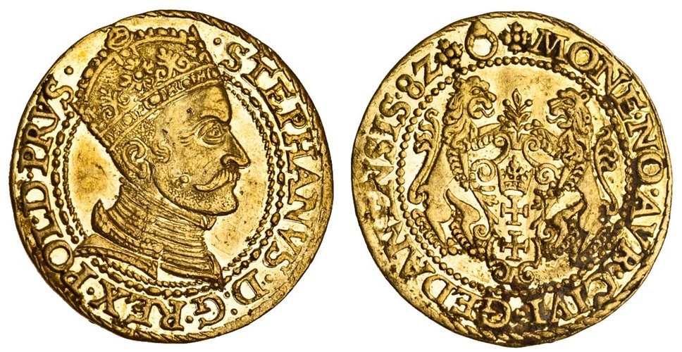 Poland, Stephan Batory (1576-86), Ducat, 1582, 3.51g, Gdansk (Danzig), stephanvs. d:g. rex. pol. d. prvs.crowned and cuirassed bust right, rev. mone. no. avr. civi. gedanensis. 8z. (ring), city shield with supporters (F.3; HCz.691 - R3), small scratch on armour, some deposit on reverse, extremely fine with brilliance, rare