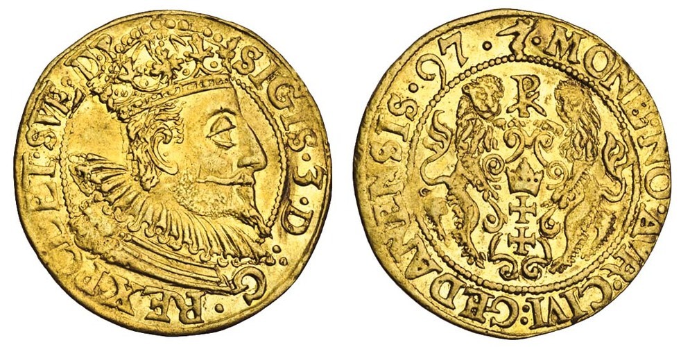 Poland, Sigismund III Vasa (1587-1632), Ducat, 1597, 3.47g, Gdansk (Danzig), sigis. 3. d.: g. rex. pol. et. sve.dp, crowned and cuirassed bust right, with wide ruff, rev. mone. no. avr. civi: gedanensis. 97., Chi-Rho above city shield with supporters (F. 10; HCz 9545 - R), about extremely fine, scarce