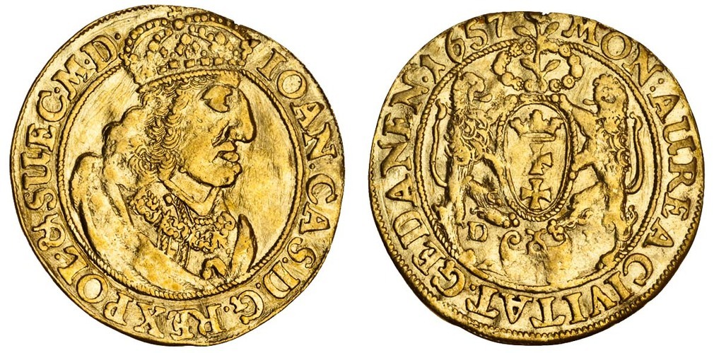 Poland, John II Casimir (1649-68), Ducat, 3.32g, 1657, Gdansk (Danzig), ioan. cas. d.g. rex pol. & suec. m.d., crowned and draped bust right, rev. mon. aurea civitat gedanen, shield with supporters (F.24; Gum.1927; H.Cz.7639 - R4), slightly creased, from a mount, fine, very rare