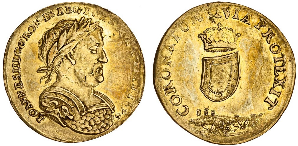 Poland, John III Sobieski (1674-96), Coronation, 1676, gold jeton of 2-Ducats, 6.99g, ioannes iii coron in reg. pol. &. m.d.l. 2 feb. 1676, laureate bust right, wearing scaled armour, with lion's face on shoulder, rev. coronatur qvia protexit, crowned buckler above landscape with three towers, 27mm. (cf. H.Cz.2413 in silver, not listed in gold), edge smoothed from a mount (?), very fine, extremely rare