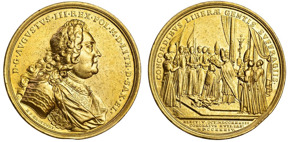 Poland, Augustus III (1733-63), Coronation, 1734, gold medal, 86.5g, by H P Groskurt, to the weight of 25-Ducats, d. g. avgvstvs. iii. rex. pol. m. d. lith. d. sax. el., laureate, draped and cuirassed bust right, rev. concordibvs liberae gentis svffragiis, coronation scene, in exergue elect: v. oct: mdccxxxiii coronatvs xvii. ian: mdccxxxiv, edge plain (HCz 9916 - R4), very fine, very rare in gold