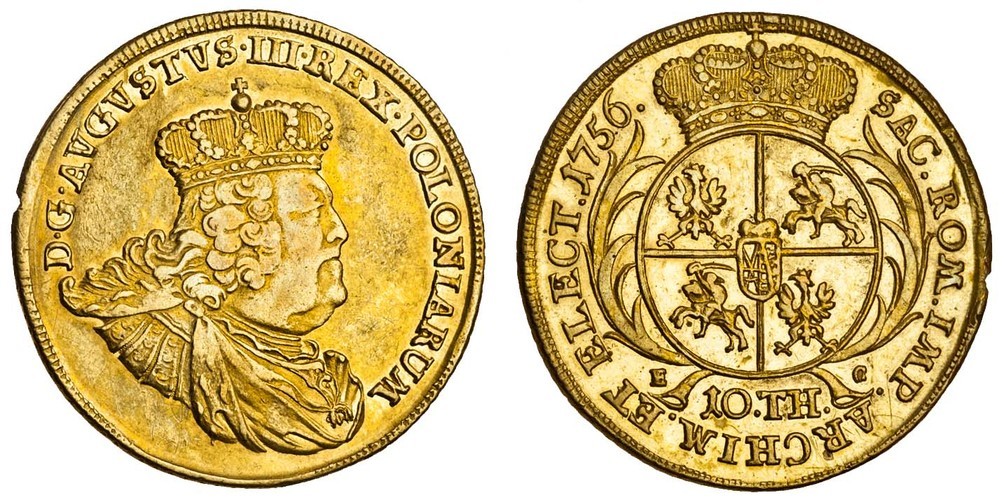 Poland, Augustus III of Saxony (1733-63), 10-Talers (Double August d'or), 13.22g, 1756, Leipzig, crowned and draped bust right, rev. arms (F.2857 (under Saxony); Gum.2198; HCz 2912 - R2), marks on edge, removed from a mount, fine, rare