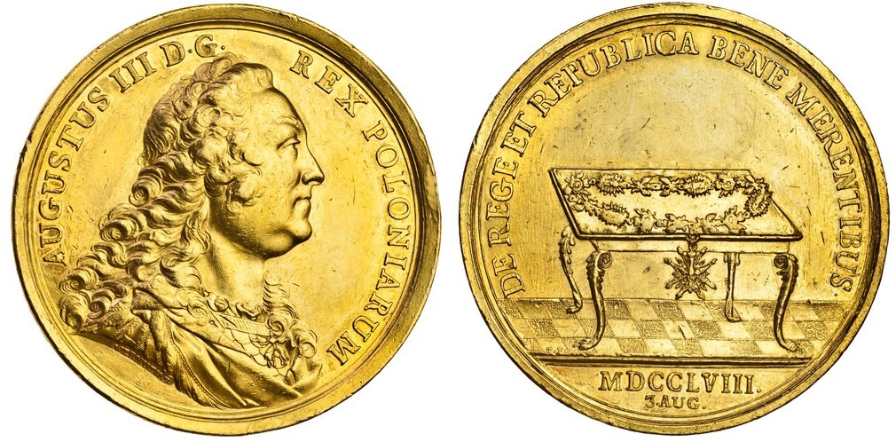 Poland, Augustus III (1733-63), gold medal on the yearly Feast of the White Eagle, 1758, 83.35g, augustus iii d.g. rex poloniarum, draped and cuirassed bust right, signed wermuth.f. on truncation, rev. de rege et republica bene merentibus, Collar and Badge of the Order on a table, in exergue mdcclviii 3 aug., edge plain (cf. HCz.5994 - in silver, not listed in gold), some smoothing in fields, very fine, extremely rare