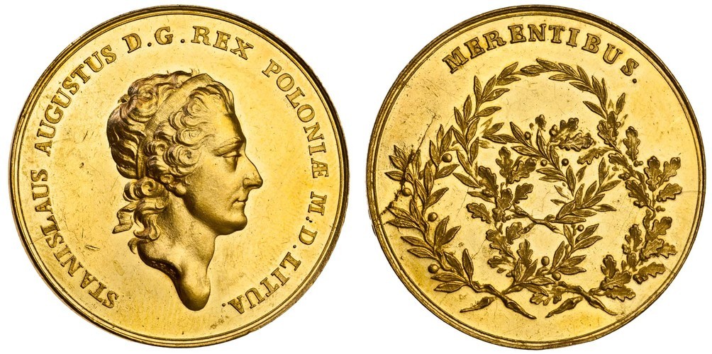 Poland, Stanislaus Augustus (1764-95), gold Medal for Merit, 45.07g, undated, stanislaus augustus d.g. rex poloniae m.d. litua., head right, hair held in band, signed on truncation i.p.h., rev. merentibus., wreaths of olive, laurel, and oak, 40mm. (H.Cz.3381 - R5; Raczynski 497), hairlines, extremely fine, extremely rare