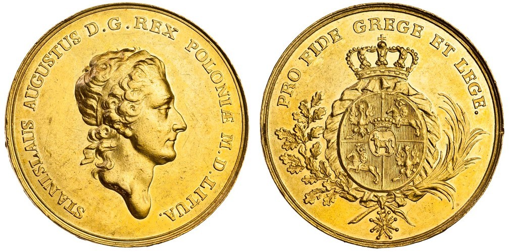 Poland, Stanislaus Augustus (1764-95) gold medal, to the wieght of 10-Ducats, 35.84g, undated (c.1780), stanislaus augustus d.g. rex poloniae m.d. litua, head right, hair held in band, signed on truncation i.p.h., rev. pro fide grege et lege, crowned shield surrounded by ribband of the Order of the White Eagle, resting on branches of oak and palm, badge of the order suspended below, 40mm. (H.Cz.3399 - R3), some hairlines, and one or two very minor marks on edge, otherwise extremely fine and very rare