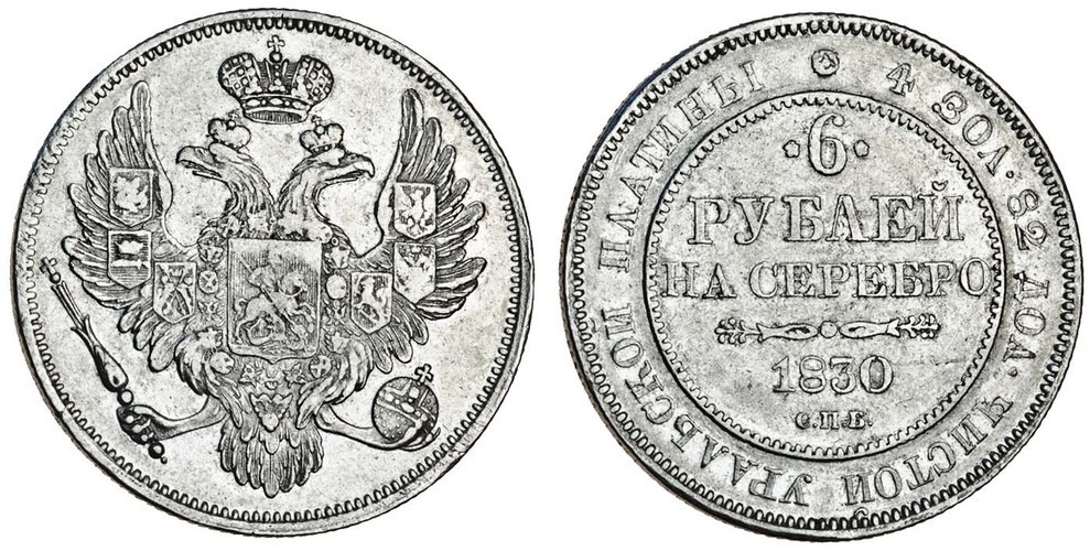 Russia, Nicholas I (1825-55), platinum 6-Roubles, 1830, 20.57g, St Petersburg, Imperial double-headed eagle, rev. value over date (Bitkin 56; F.159; Sev.599), very fine