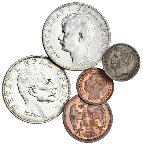 Serbia, Prince Michael Obrenovich III (1860-68), AE Para (2), 1868, Alexander II (1889-1902), 2-Dinara, 1897, Peter I (1903-18), 2-Dinara, 1904, AE 2-Pare, 1904 (KM.1.1, 22, 23, 26.1), about extremely fine or better, AE coins with lustre (5)