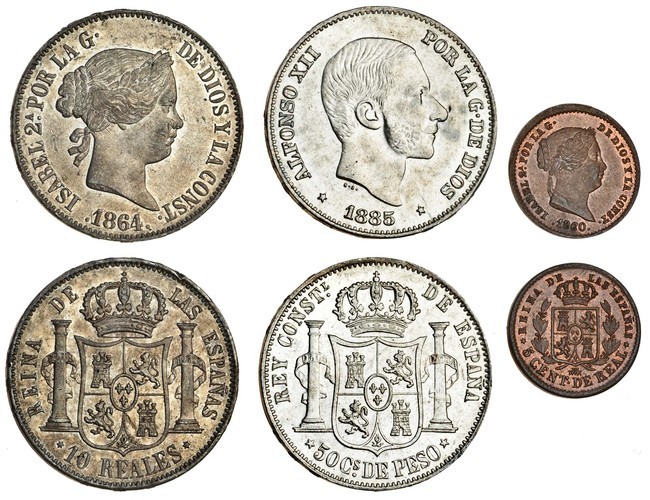 Spain, Isabel II, 10-Reales, 1863, AE 5-Centimos, 1860, (KM.602, 611.2), the first extremely fine, the second a little better, with lustre; Philippines, Alfonso XII (1874-1885), 50-Centimos, 1885 (KM.150), extremely fine (3)