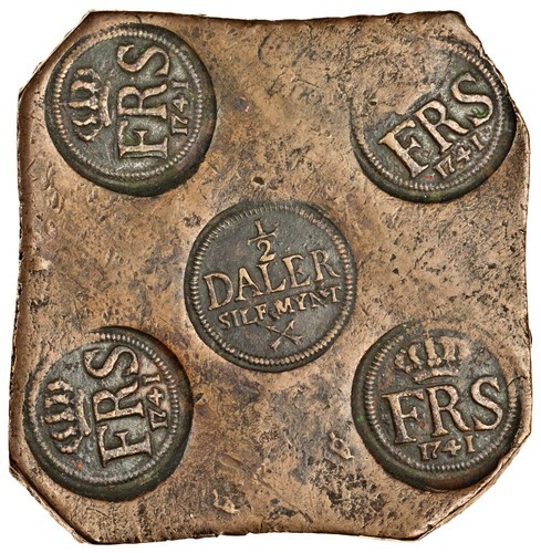 Sweden, Frederik I (1720-51), Half-Daler, 1741, copper plate money, central stamp with value, four corner stamps with crowned initials and date, approx. 97 x 98 mm (AAH 293; KM.PM65), clipped corners, one stamp weak on crown, very fine