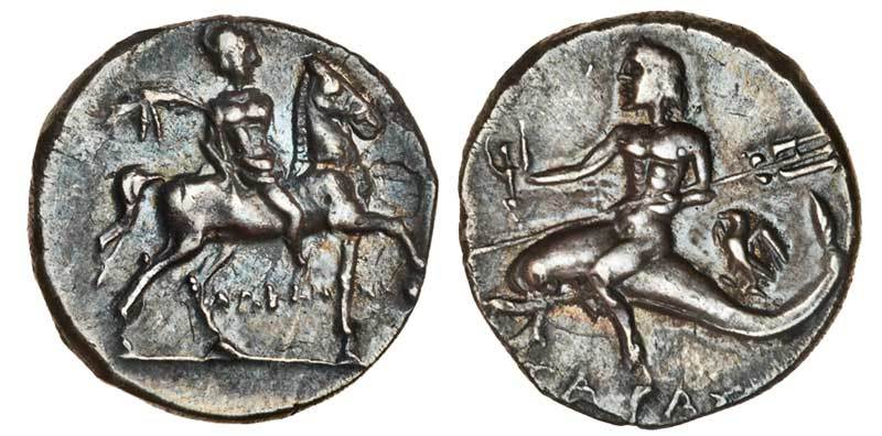 Calabria, Tarentum (c.212-209 BC), AR Punic Half Shekel, 3.38g, horseman right, holding filleted palm-branch, KANNA beneath, rev. TAPA, boy astride dolphin left, holding kantharos and trident, eagle behind (Vlasto 986; Hist. Num. 1082), cabinet tone, very fine