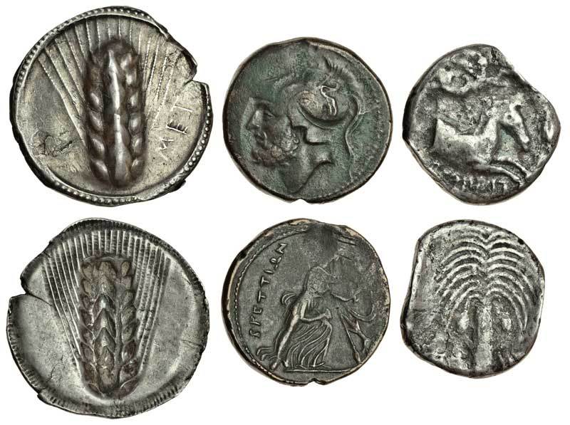 Lucania, Metapontum (c.520-510 BC), AR Stater, 8.10g, ear of barley, MET on right, rev. incuse of obverse (Noe 78; Hist. Num. 1467), almost very fine, together with Carthage (c.410-395 BC), AR Tetradrachm, 12.83g, forepart of horse right, Nike flying above, ear of grain on right, Punic script below, rev. palm-tree (cf. Jenkins pl. 2), edge hammered, rare, fine, and a 27mm AE Didrachm of The Brettii (c.208-203 BC), helmeted head of Ares left, rev. Athena advancing right, holding shield and spear, thunderbolt on right (SNG ANS 76), some weakness, almost very fine (3)