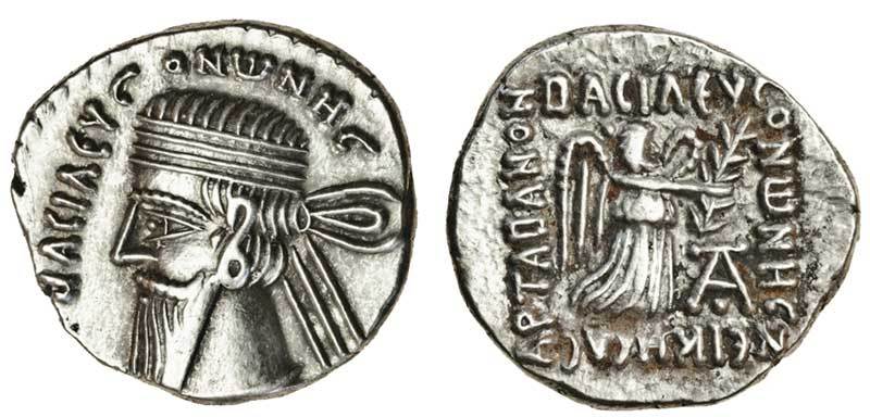 Kingdom of Parthia, Vonones I (c.AD 8-12), AR Drachm, 3.85g, Ecbatana, diademed head left, BACIEYC ONWNHC, rev. Nike standing right, holding wreath and palm-branch, monogram before, square four-line legend (Sellwood 60.5; Sunrise 407),