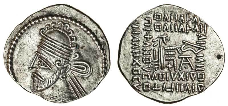 Kingdom of Parthia, Pakoros I (c.AD 78-120), AR Drachm, 3.51g, diademed bust left, wearing tiara with "hooks" along crest, rev. archer seated right, holding out bow, monogram before, square seven-line legend (Sellwood 77.8; Sunrise 434), good very fine
