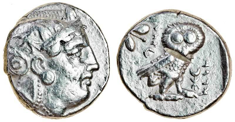 Egypt under Persian administration, Satrap Sabakes (c.340-333 BC), AR Tetradrachm, 17.18g, helmeted head of Athena right, rev. owl standing right, head facing, olive-spray and crescent behind, Aramaic inscription above and to right, symbol on right (SNG Copenhagen (Ptolemies), 4), small test-cut on neck of owl, very fine
