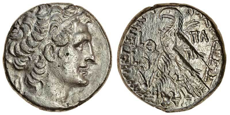 Kingdom of Egypt, Cleopatra VII (51-30 BC), AR Tetradrachm, 14.11g, Alexandria, 44/43 BC, diademed Ptolemaic head right, aegis round neck, rev eagle standing left on thunderbolt, date L (= year 9) on left over headdress of Isis (SNG Copenhagen 403; Svoronos 1823), light double striking on reverse, very fine