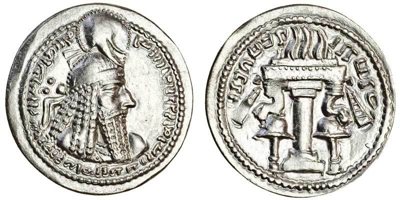 Sasanian Empire, Ardaser I (AD 223/4-240), AR Drachm, 4.36g, draped bust right wearing close-fitting headdress surmounted by korymbos, two pellets behind, rev. fire-altar (cf. SNS 135), scarce variety, extremely fine