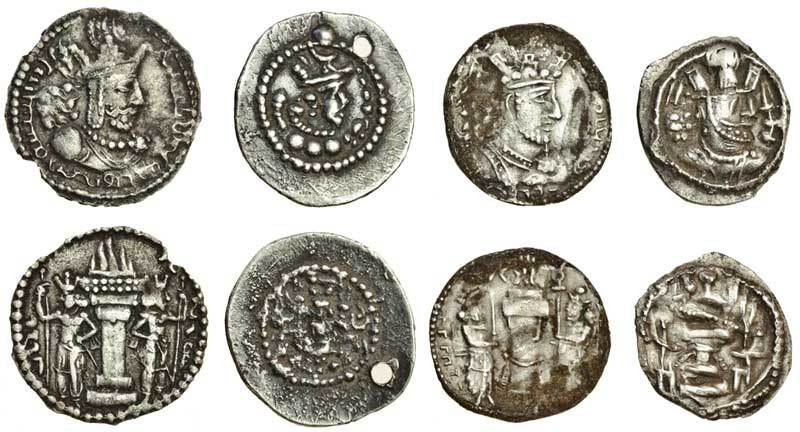 Sasanian Empire, AR Obols (4) of Shapur I (AD 240-272), 0.62g, bust right, wearing turreted crown with cheek-pieces, surmounted by korymbos, rev. fire-altar and two regal attendants (Göbl 33; cf. SNS 20ff), Shapur II (2) (AD 309-379), 0.32g and 0.60g, bust right, wearing turreted crown, one with uncertain symbol before, rev. fire-altar and attendants (cf. SNS 232ff, Sunrise 850ff and Göbl 101ff), good fine to almost very fine, and Peroz (c.AD 457-484), 0.52g, draped bust right wearing mural crown with anterior crescent and surmounted by korymbos set on crescent, rev. as last (cf. Sunrise 947), pierced in margin, very fine (4)