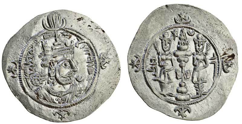 Sasanian Empire, Kavad II (AD 628), AR Drachm, 4.16g, draped bust right, wearing crown with turret and crescent, surmounted by korymbos on crescent-shaped platform, rev. fire-altar between two attendants, star and crescent either side of flames, year 2, NY (H. M. Malek, Num. Chron. 1995, 15, pl.24, 7), scarce, extremely fine