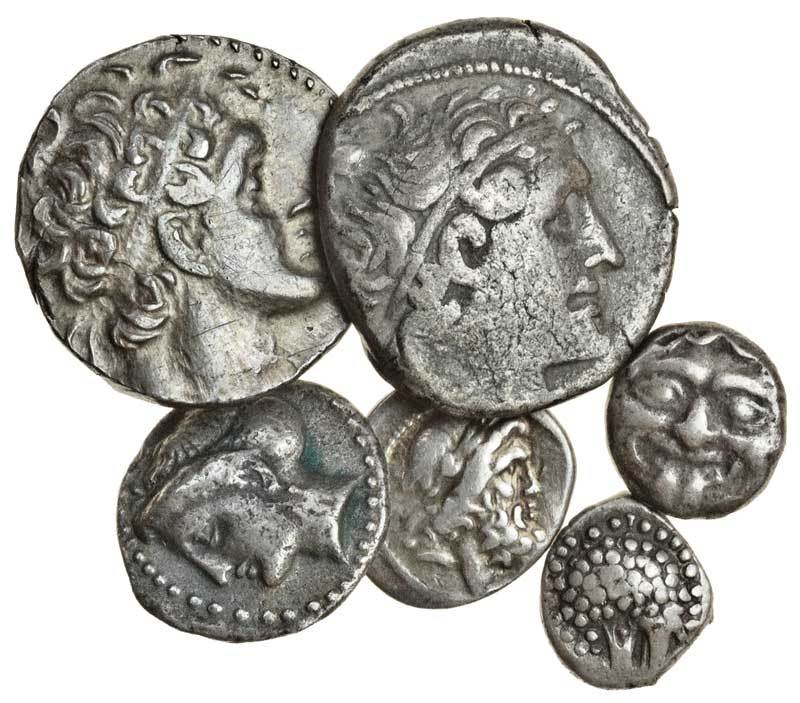Miscellaneous Greek silver, comprising Achaean League, Hemidrachm, 2.15g of Pallantion (early 1st cent. BC), laureate head of Zeus right rev. A around AX monogram, trident-head and monogram below, all in wreath (BMC 124), Sinope (c.410-350 BC), AR Drachm, 4.62g, head of nymph Sinope left, rev. sea-eagle on dolphin left (cf. SNG BM 1380ff), Parion (5th cent. BC) Hemidrachm, 3.17g, gorgoneion, rev. linearly divided incuse square (cf. BMC 1-13), an uncertain Hemidrachm (c.5th cent. BC), 1.75g, lion's head left, rev. five pellets arranged in quadripartite division, and two AR Tetradrachms of Ptolemaic Egypt, Ptolemy VIII (145-116 BC), 14.26g, Kition, 142/141 BC, diademed Ptolemaic head right, rev. eagle standing left on thunderbolt, date LK to left, KI behind (cf. SNG Copenhagen 573 and 594), and Cleopatra VII (51-30 BC), 13.79g, Alexandria, 35/34 BC, diademed Ptolemaic head right, rev. as last but date LIH (= year 18)and headdress of Isis to left, A behind (SNG Copenhagen 414), good fine to good very fine (6)