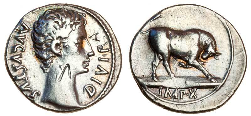 Augustus (27 BC-AD 14), AR Denarius, Lugdunum, 15-13 BC, bare head right, rev. IMP X in exergue, bull butting right on broad ground-line (RIC 167a; BMC 451; RSC 137), banker's marks on neck and before head, very fine