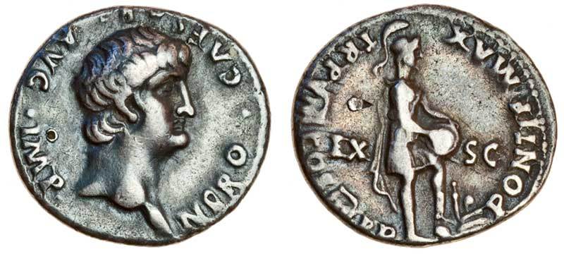 Nero (AD 54-68), AR Denarius, Lugdunum, 61/2, bare head right, rev. PONTIF MAX TRP VIII COS IIII PP, EX - SC, Roma standing right, foot on arms, inscribing shield set on knee (RIC 33; BMC 36; RSC 226), cabinet tone, very fine