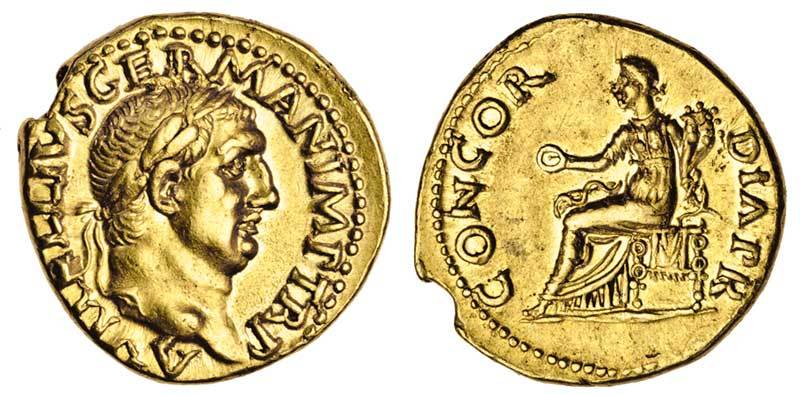 Vitellius (2nd Jan.-20th Dec. AD 69), AV Aureus, 7.27g, Rome, laureate head right, a vitellivs german imp tr p, rev. concordia p r, Concordia seated left, holding patera and cornucopia (RIC 72; BMC 6; C.19), a most attractive example, lustrous, extremely fine