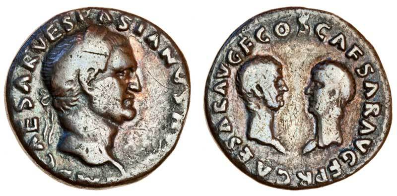 Vespasian (AD 69-79), AR Denarius, Rome, 69/70, laureate head right, rev. CAESAR AVG F COS CAESAR AVG F PR, bare heads of Titus and Domitian facing each other (RIC 16; BMC 368;RSC 5), toned, rare, good fine